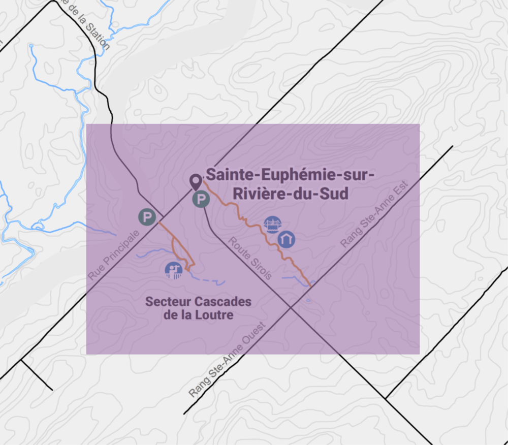 Accessible en bordure de la rue Principale à Sainte-Euphémie-sur-Rivière-du-Sud, ce secteur du Parc vous fera découvrir un petit coin de paradis avec les cascades de la rivière à la Loutre. Le sentier hivernal le Gros Rocher s'est ajouté depuis peu avec un parcours de 2.6 km débutant derrière l'église et accessible l'hiver seulement.