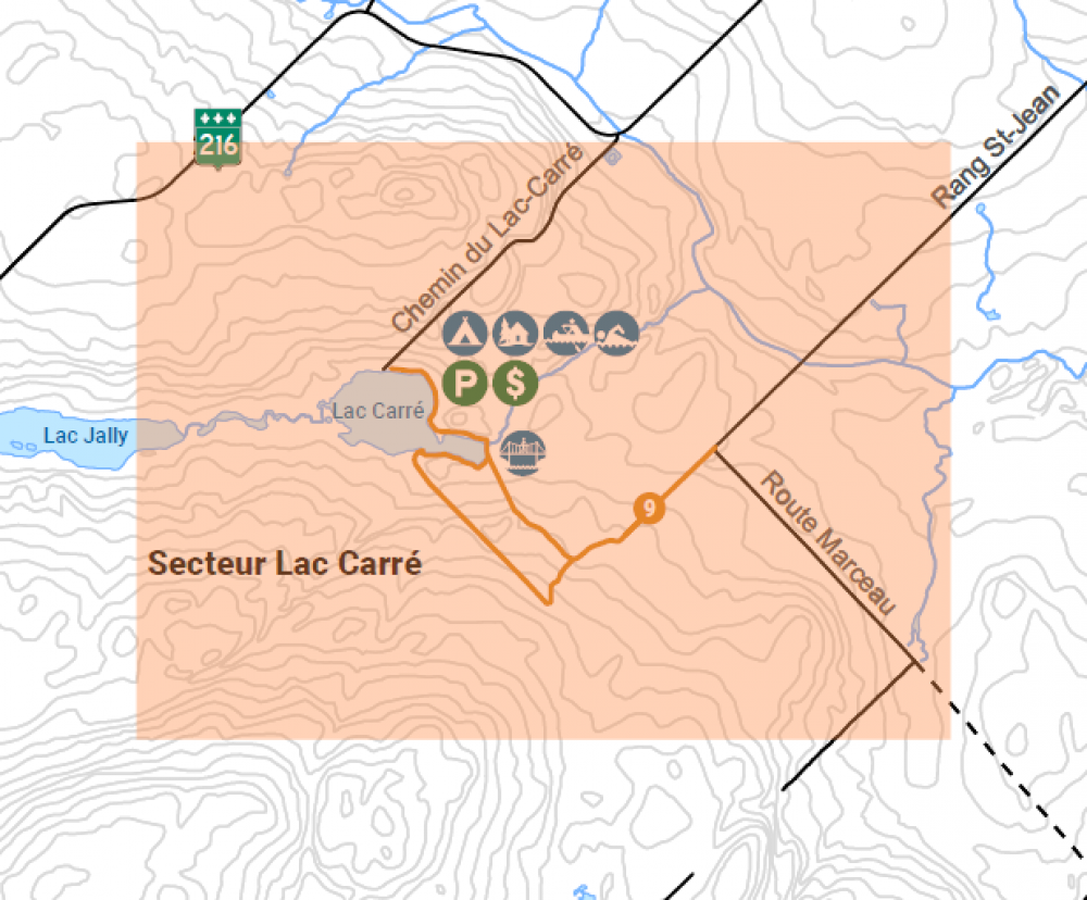 Situé à Sainte-Apolline-de-Patton, ce secteur prisé du Parc en saison estivale est avant tout un lieu de villégiature. Sis sur les berges du lac Carré, le Centre plein air Sainte-Apolline est l'hôte de plusieurs activités familiales et où il est possible de passer la nuit. L'excellente qualité de l'eau fait du Lac Carré un lieu idéal pour la baignade.