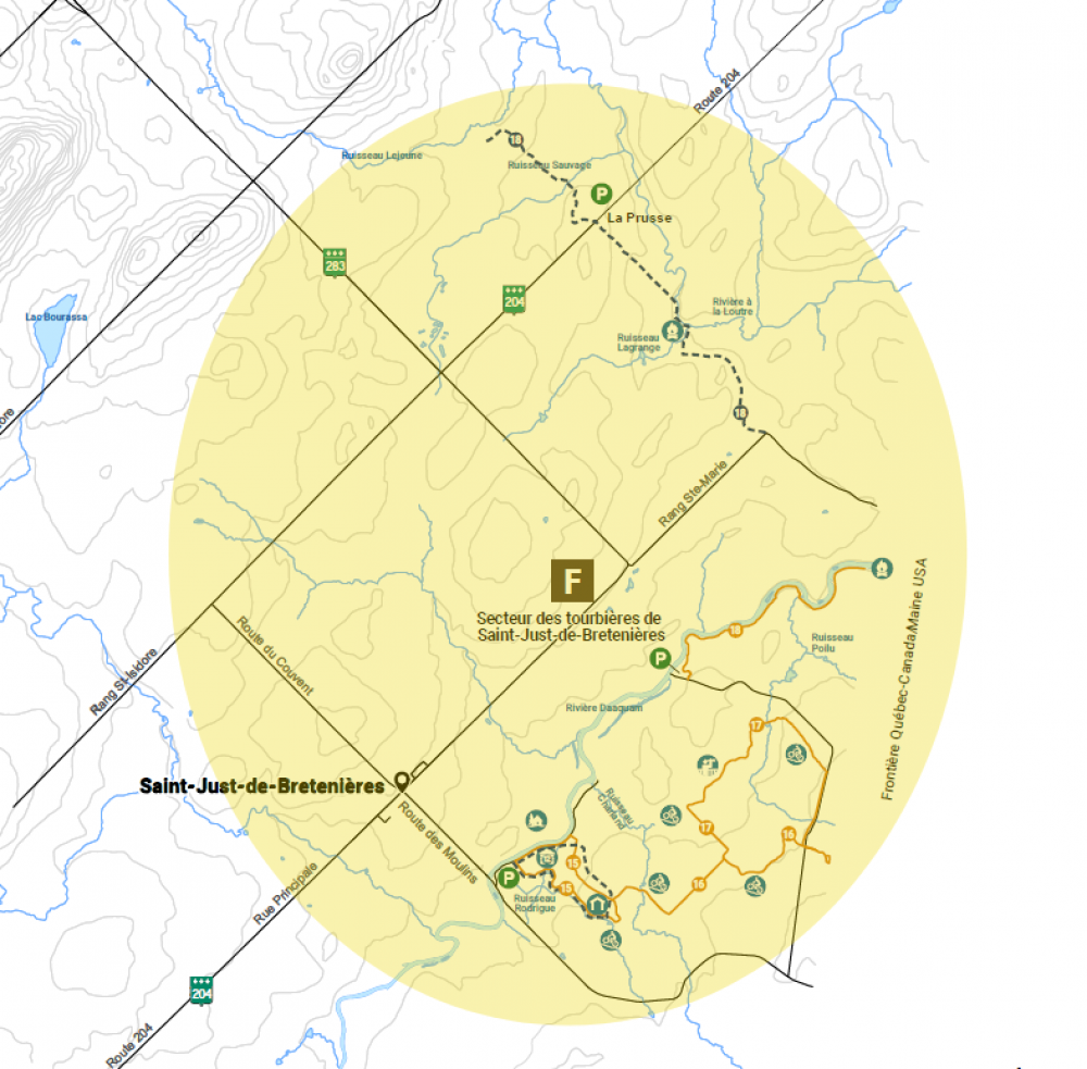 Situé au sud du territoire dans la municipalité de Saint-Just-de-Bretenières, ce secteur est sans contredit l'un des plus remarquables avec son immense tourbière. À vélo, roulez au coeur d'une magnifique forêt boréale, observez l'orignal et le tétras du Canada, et découvrez l'écosystème mystérieux des tourbières.