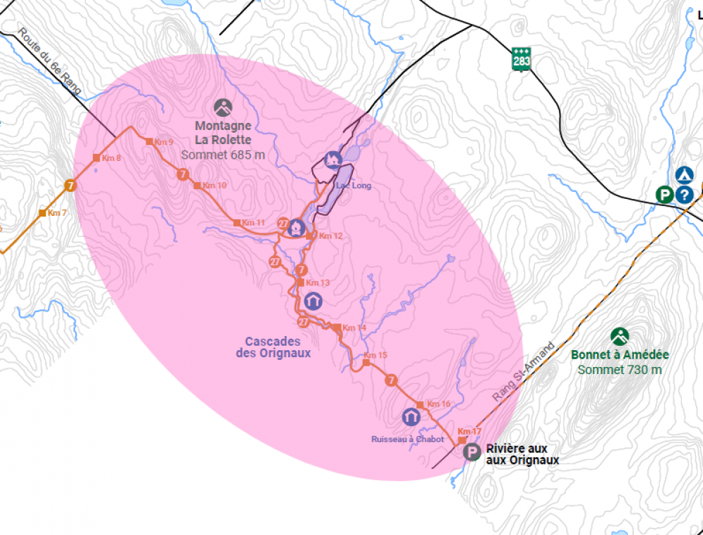 Découvrez le plaisir de randonner en bordure d'un cours d'eau en explorant ce secteur du Parc. Le sentier des Orignaux est à la fois facile et difficile, selon le trajet que vous emprunterez. Vos efforts seront récompensés par la vue que vous aurez de la rivière aux Orignaux et de ses cascades. Poursuivez votre randonnée en direction du lac Long.