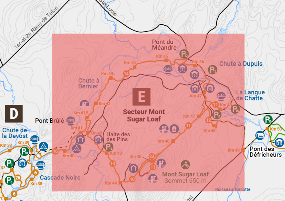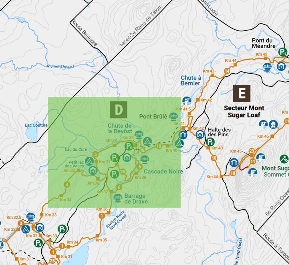Non loin du mont Sugar Loaf, ce secteur du Parc offre des sentiers pédestres davantage adaptés à la famille. Découvrez la rivière Noire Nord-Ouest en canot, en kayak ou lors d'une agréable balade en ponton. Durant la saison hivernale, le Parc met à votre disposition un parcours de 9 km de trottinette des neiges et de fatbike.