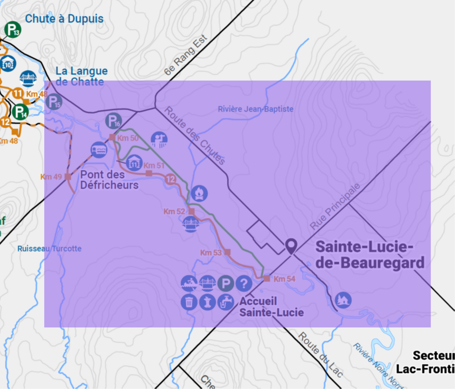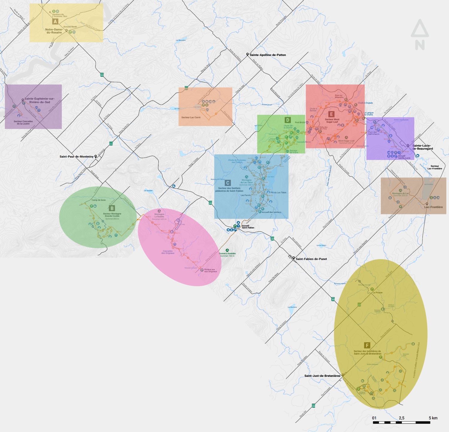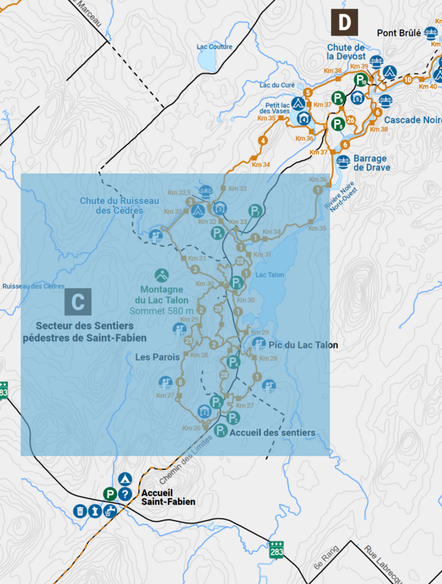 Situé à Saint-Fabien-de-Panet, ce secteur vous permet de découvrir un diversité de paysages, le ruisseau des Cèdres et sa chute à paliers, le lac Talon et une magnifique forêt à végétation changeante.