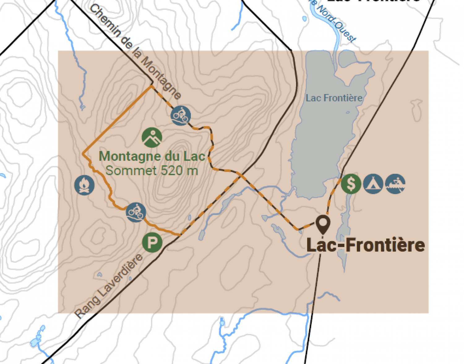 Ce petit secteur du Parc est davantage connu pour sa pêche au maskinongé. Sur les abords du lac se trouve le Camping municipal Lac-Frontière qui offre des emplacements de camping et des chalets pour le plaisir des villégiateurs. La location de kayaks et de planches à pagaie agrémentera votre séjour. Les plus sportifs pourront se défouler à vélo dans le sentier de la Montagne du Lac.