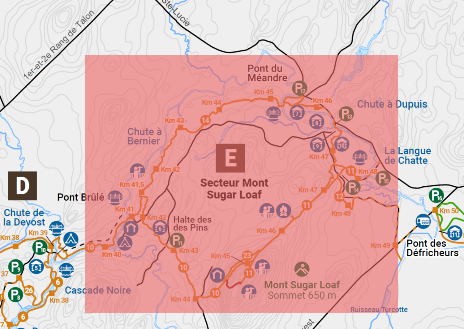 Ce site situé à Saint-Fabien-de-Panet est un des secteurs incontournables du Parc! Il met à l'avant-plan les différents cours d'eau grâce à l'aménagement de magnifiques passerelles arquées. Accessible en voiture l'été, ce secteur est fermé à la circulation automobile l'hiver et devient le terrain de jeux des amateurs de longue randonnée en raquette qui débuteront leur périple dans le secteur du mont Sugar Loaf.