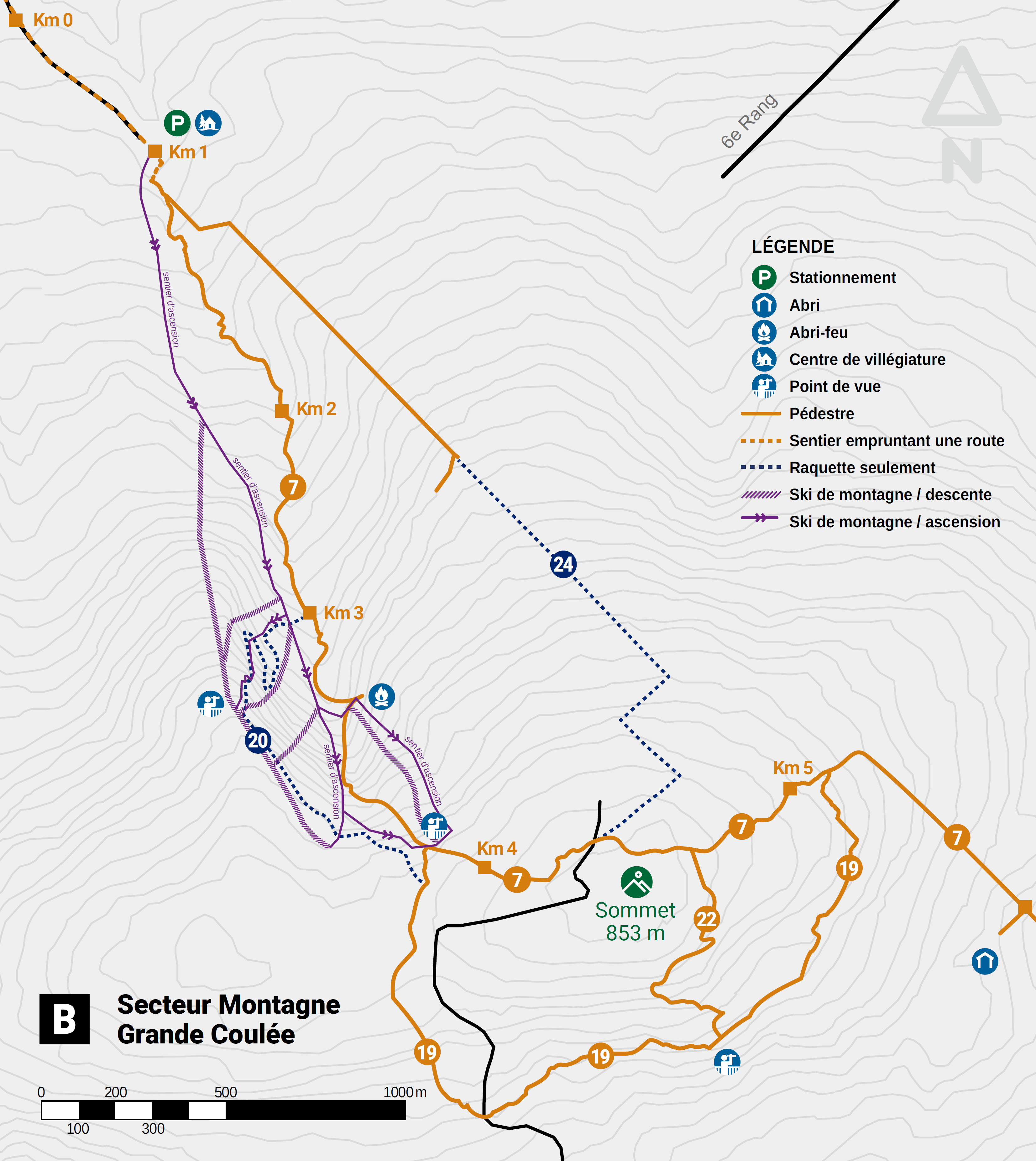 À partir du sommet, trois choix s'offrent aux randonneurs : faire demi-tour, découvrir le versant sud de la montagne par le sentier des Versants (19) (boucle de 9 km) ou poursuivre une longue randonnée en direction de l'Accueil des Orignaux (accessible en saison estivale seulement).