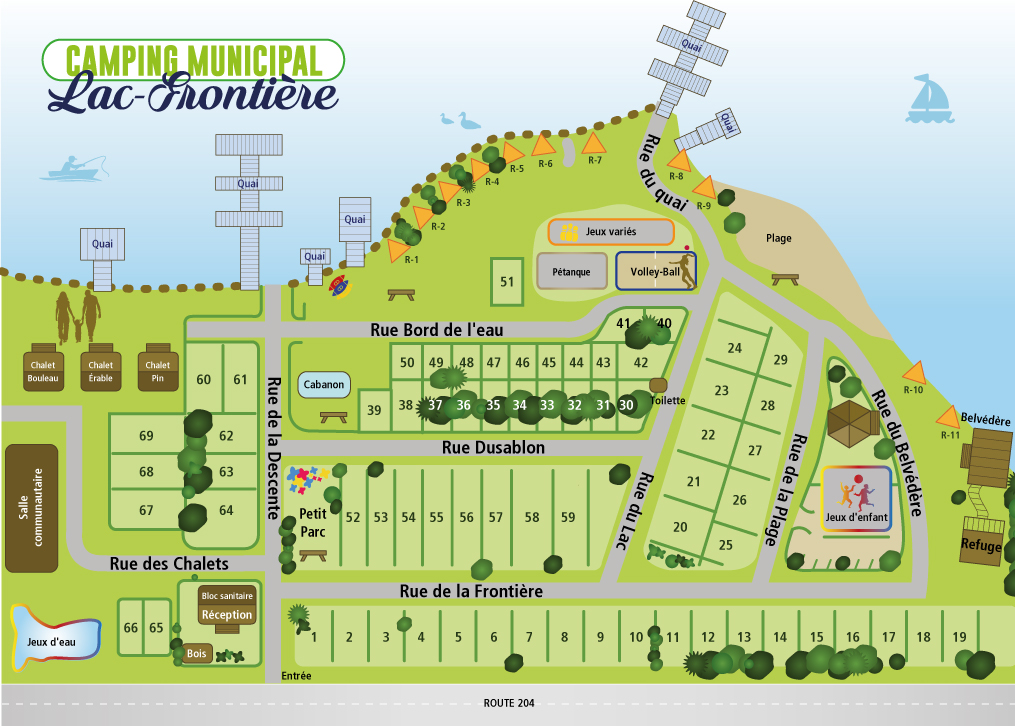 Ce camping joliment aménagé offre plus de 76 emplacements avec services et 11 emplacements sans services sur le bord du lac et 18 emplacements sauvages. Ces derniers 29 emplacements ont accès au bloc sanitaire et aux autres services du camping. Que vous soyez propriétaire d'un motorisé ou d'une tente-roulotte ou que vous désirez déployer votre tente, vous trouverez un site adapté à vos besoins. Les plus jeunes pourront s'amuser dans les jeux d'eau tandis que les plus grands pourront aller pêcher le maskinongé ou louer une embarcation et découvrir les coins cachés du lac. Nul besoin d'un réveil matin, car le huard, plutôt matinal, se chargera de vous réveiller à l'aurore pour que vous puissiez profiter pleinement de votre journée.