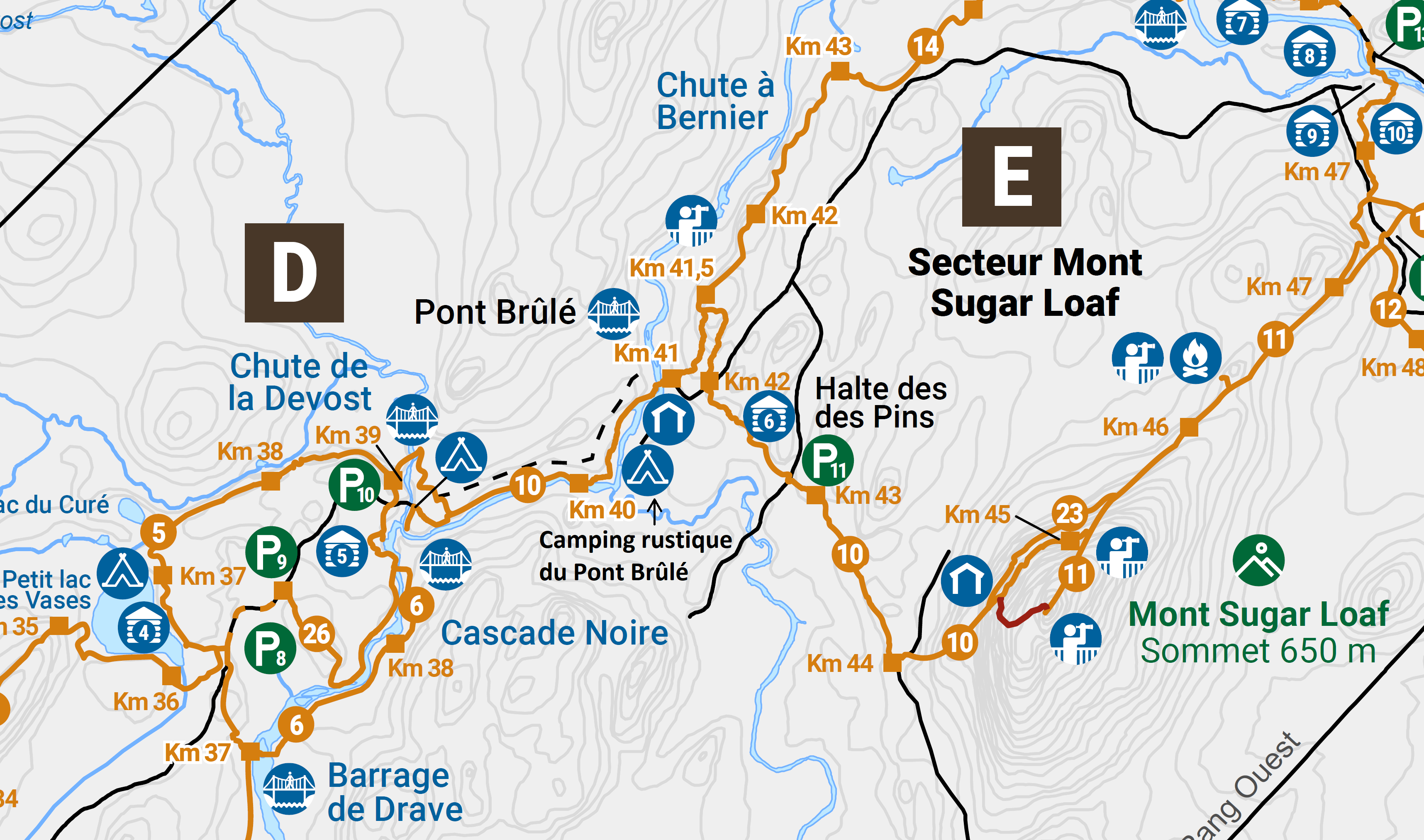 Le camping rustique du Pont Brûlé propose 2 emplacements de camping situé sur le sentier 10, à 2 km du stationnement P10 et à proximité de la rivière Noire Nord-Ouest. Vous retrouverez près de votre emplacement un abri et le son de la rivière pour vous relaxer!